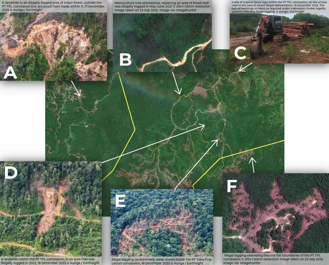 Melalui analisis citra satelit dan pengecekan lapangan, Auriga Nusantara dan Earthsight menemukan tumpukan kayu yang diduga ditebang secara ilegal (illegal logging) dan hamparan luas pembabatan hutan alam (deforestasi) di dalam konsesi PT Toba Pulp Lestari (TPL), yang tampak meluas ratusan hektare ke luar area izin perusahaan. Hutan-hutan yang dibabat tersebut berada di hulu area banjir pada DAS Batang Toru, DAS Sibundong, dan DAS Kolang yang sebagiannya berada di lereng curam, dalam area yang ditetapkan sebagai area dilindungi serta secara formal dikategorikan berisiko tinggi longsor. Citra satelit memperlihatkan adanya longsor tepat di sebelah area pembabatan hutan.